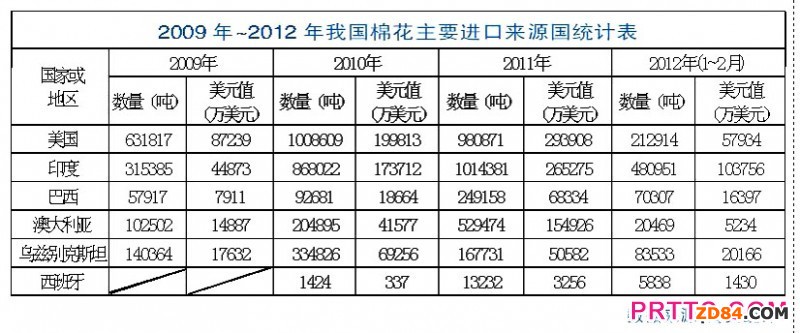 2011年全年,一般貿(mào)易為主要的棉花進(jìn)口方式,所占份額超過(guò)一半;其次是進(jìn)料加工,接近兩成;來(lái)料加工最少,不足1%。從進(jìn)口國(guó)家看,印度超過(guò)美國(guó),成為中國(guó)最大進(jìn)口來(lái)源國(guó),份額近三成;美棉以1個(gè)百分點(diǎn)之差排第二位;澳大利亞和巴西增長(zhǎng)迅速,分別為第三、第四位;烏茲別克則退居第五位。