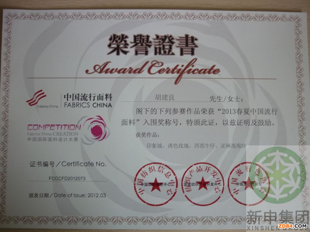 “2013春夏中國流行面料入圍”評審活動于2月23日在北京舉辦,經(jīng)過評審會評定,新申集團(tuán)參評產(chǎn)品“印象城、誘色玫瑰、西部牛仔、亞麻泡泡紗”四款面料入圍“2013春夏中國流行面料”,新申集團(tuán)同時榮獲“2013春夏中國流行面料入圍企業(yè)”稱號。