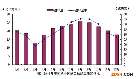 2011年,中國(guó)向美國(guó)出口的服裝和紡織品同比增長(zhǎng)了6.2%,達(dá)到406億美元。但是進(jìn)口量下降了2.5%,降到252億平方米。從中國(guó)的進(jìn)口占美國(guó)總服裝和紡織品進(jìn)口的46%。(圖3)