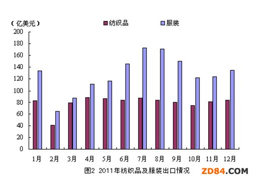 2011年12月,我國(guó)出口紡織紗線及織物83.01億美元,出口服裝及衣著附件134.42億美元,分別比11月增長(zhǎng)了3.32%、9.28%,紡織品及服裝出口增幅均降至個(gè)位數(shù)(圖2)。