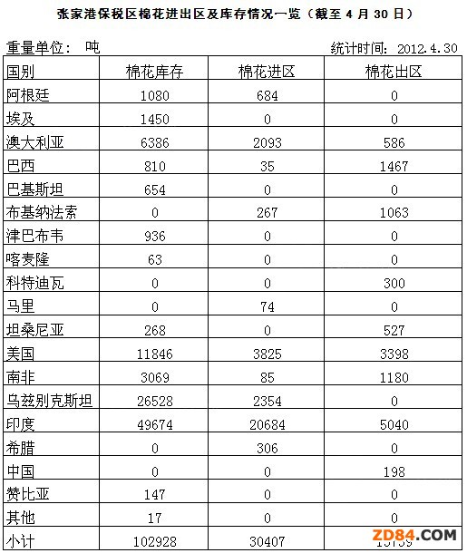 截至4月30日,2012年江蘇張家港保稅區(qū)和物流園區(qū)保稅棉花進(jìn)區(qū)30407噸,出區(qū)13759噸,其中2012年4月23-29日的一周內(nèi),張家港保稅港區(qū)保稅棉花進(jìn)區(qū)3373噸,出區(qū)6027噸,目前保稅棉花庫存約102928噸。